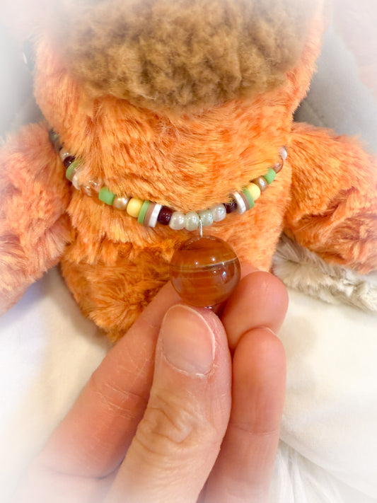 bear that literally fits in the palm of your hand!! I am over the moon on how CUTE this tiny sized bear is and the necklace it is adorned by the beads are extra special and the pumpkin charm got me all giddy! It is mind blowing how can one make something as detailed as this in