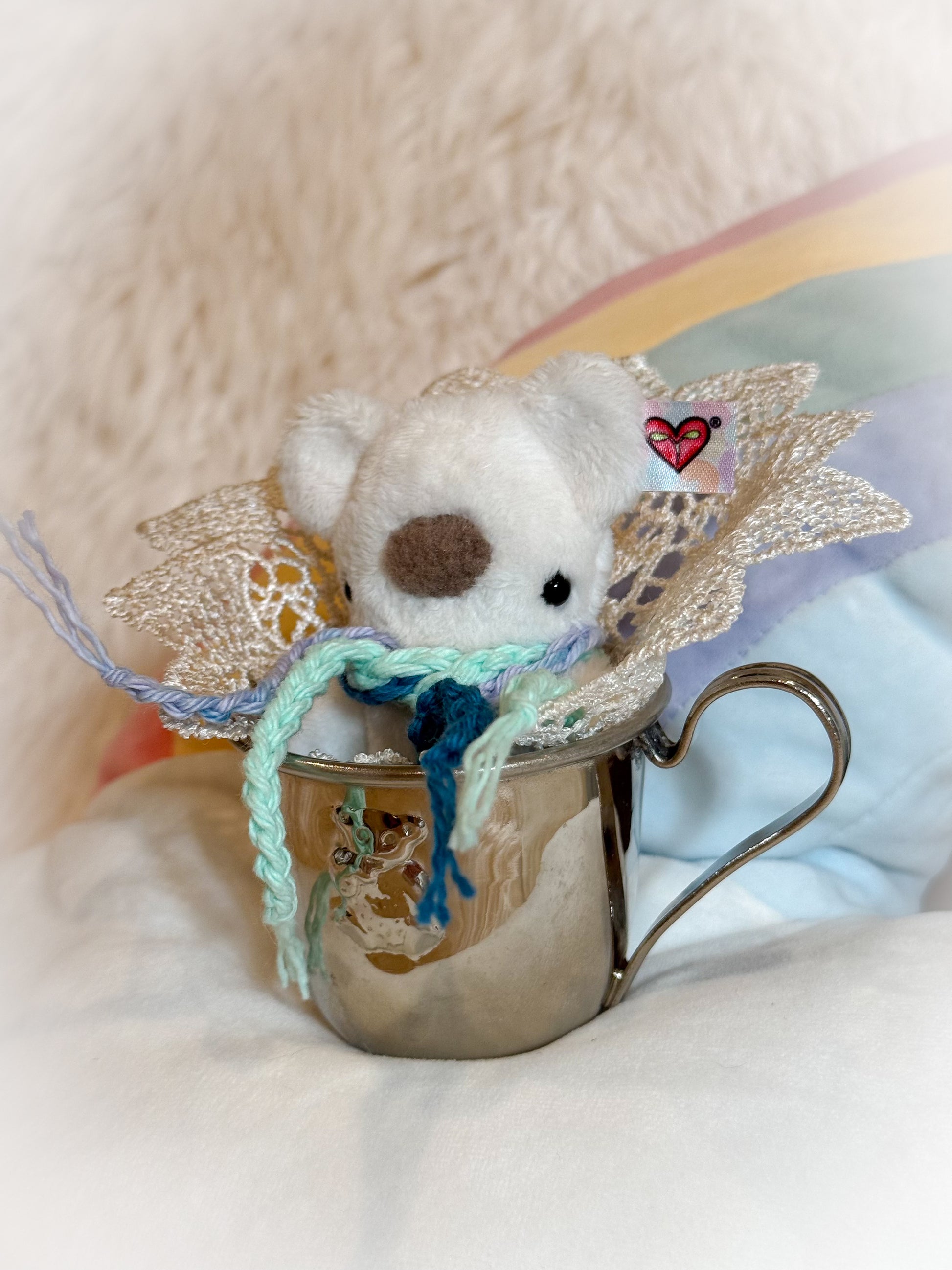 -Polar Teddi comes with vintage silver baby bear mug & hand dyed lace doilie (rainbow pillow not included)