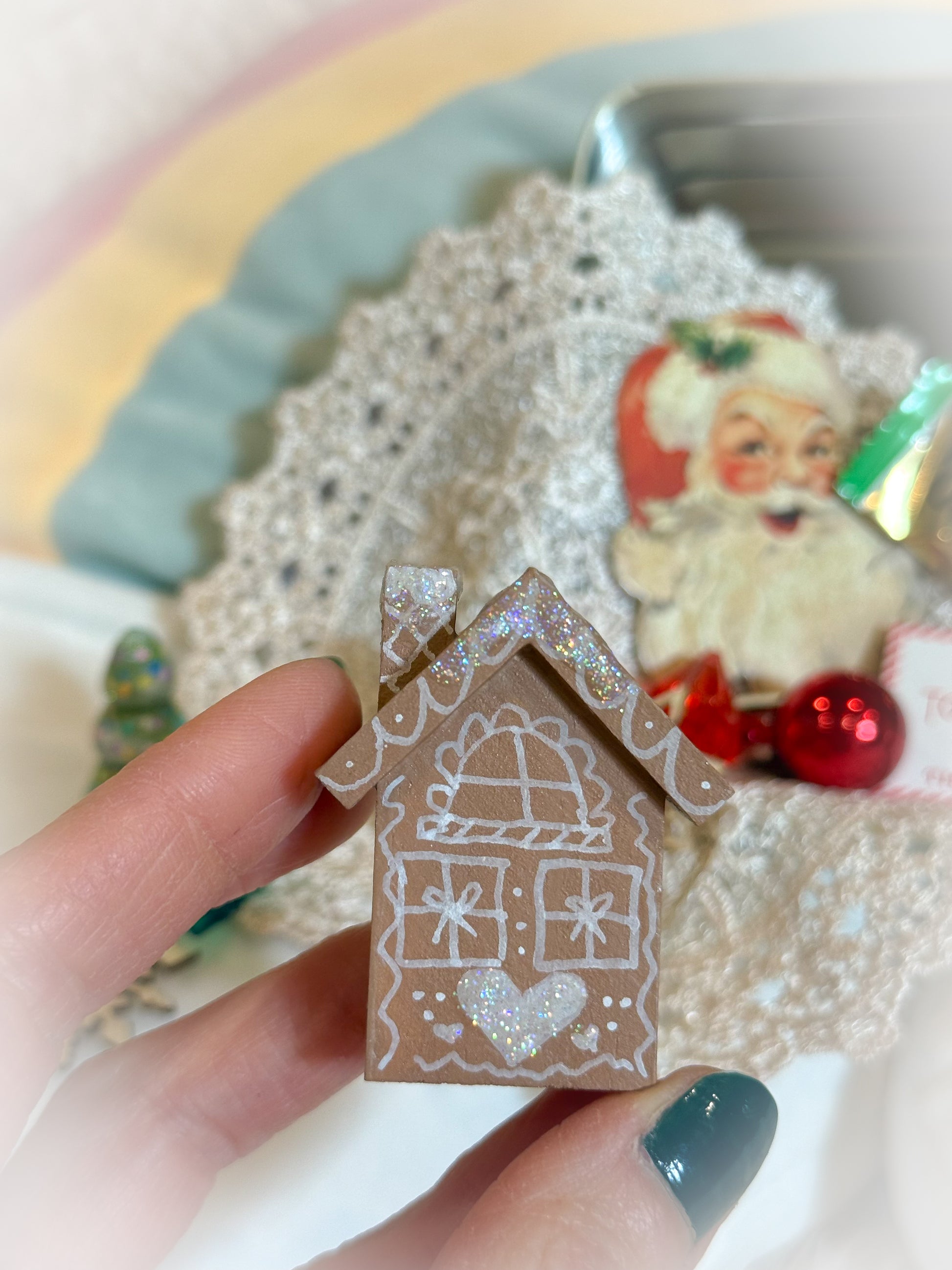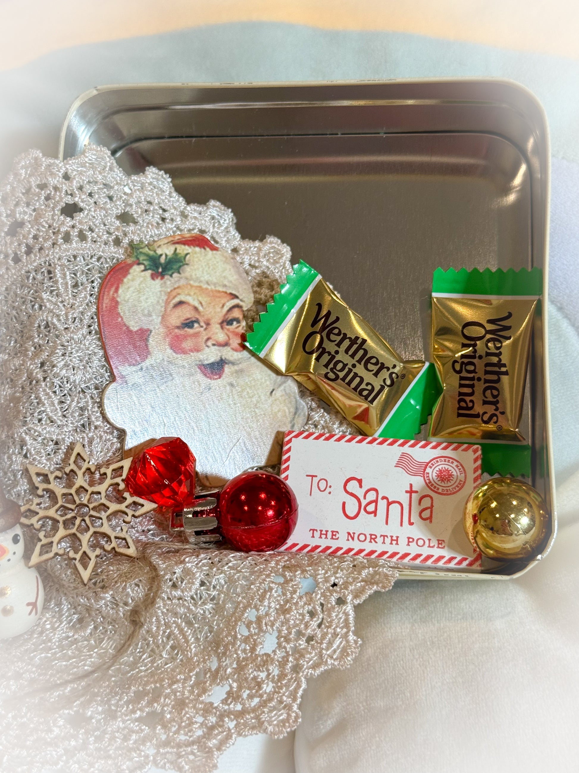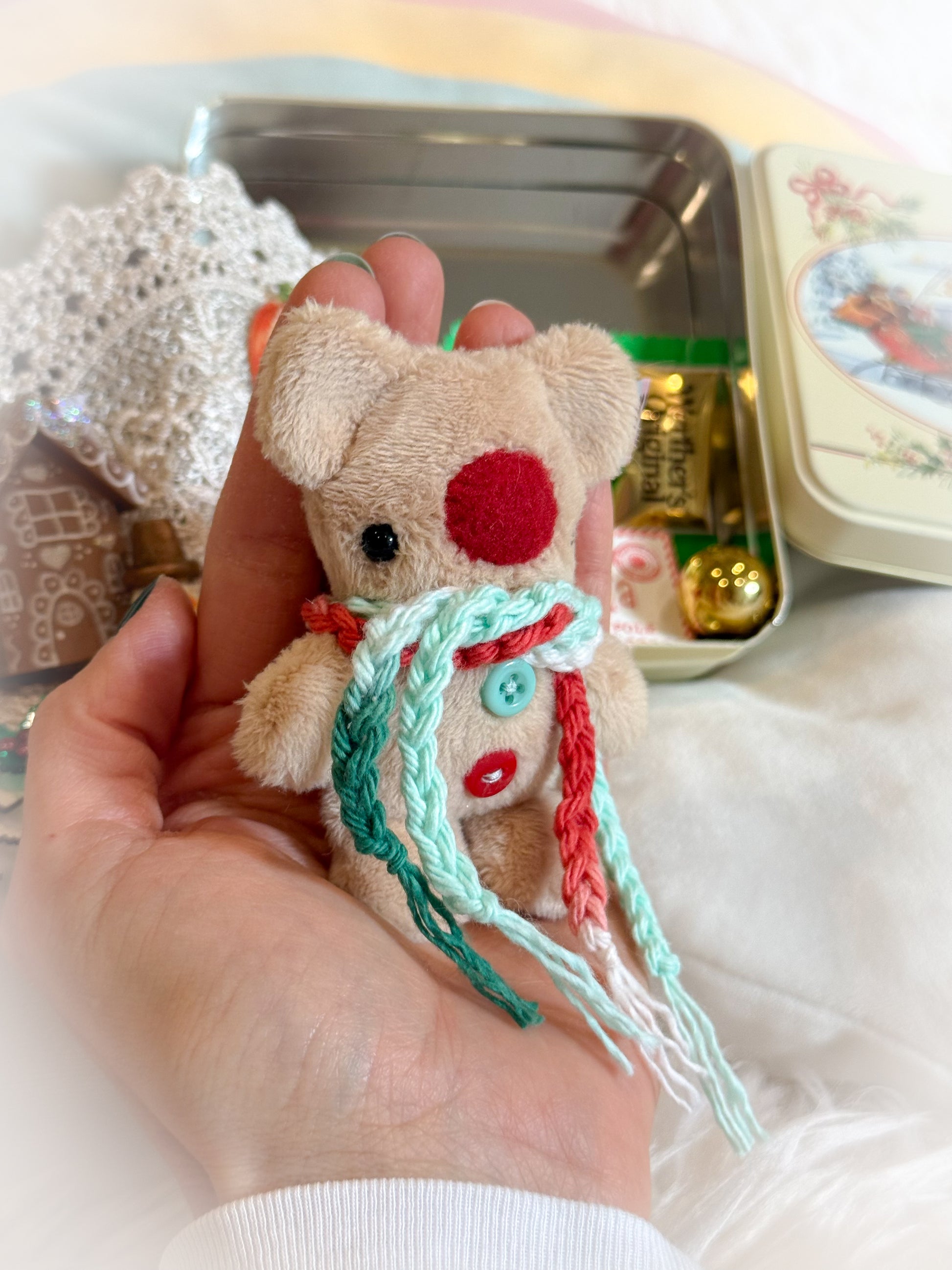 Tiny Teddi Gingi is a brand new design for 2025, he's weighted with glass & comes inside a beautiful vintage collectors tin chalked full of holiday goodies. Each special Teddi Gingi is featured in a beautiful vintage cookie tin that's stuffed full of fun holiday items to keep him busy all season long. Use him as a display piece or take him on all your adventures via your pocket!!
