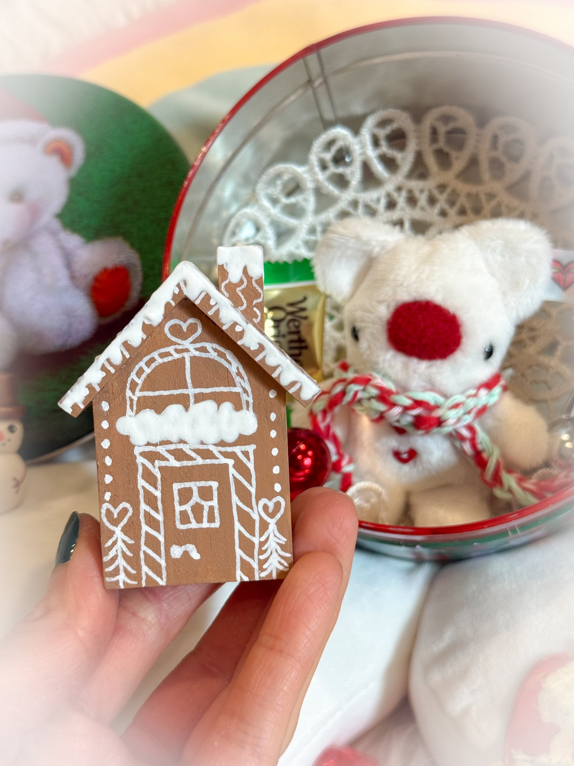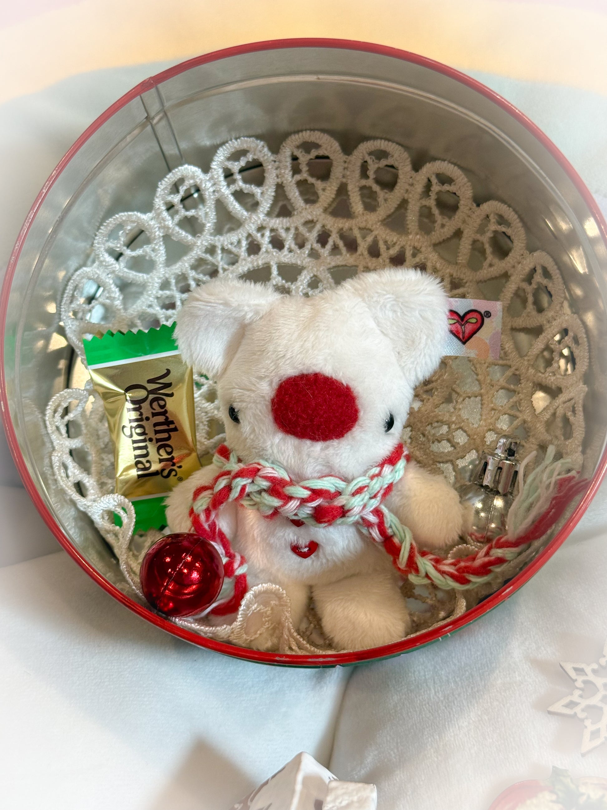 Tiny Teddi Gingi is a brand new design for 2025, he's weighted with glass & comes inside a beautiful vintage collectors tin chalked full of holiday goodies. Each special Teddi Gingi is featured in a beautiful vintage cookie tin that's stuffed full of fun holiday items to keep him busy all season long. Use him as a display piece or take him on all your adventures via your pocket!!
