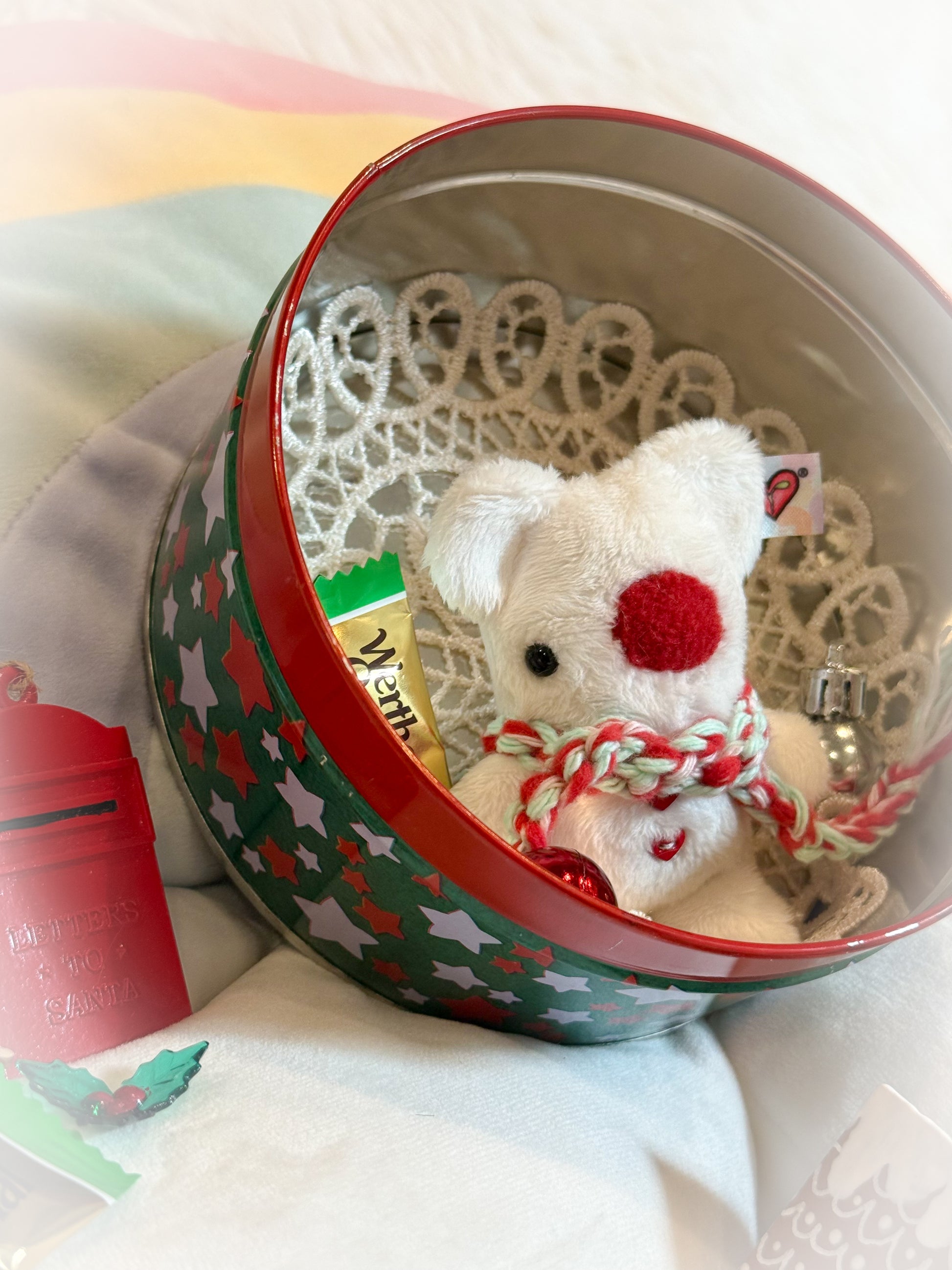 -Teddi Gingi comes with all xmas items shown with vintage collectors tin, (rainbow pillow not included)