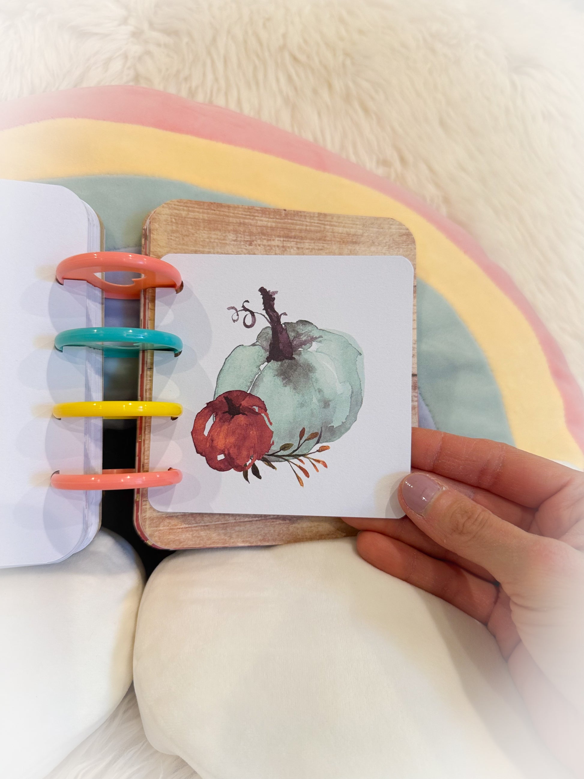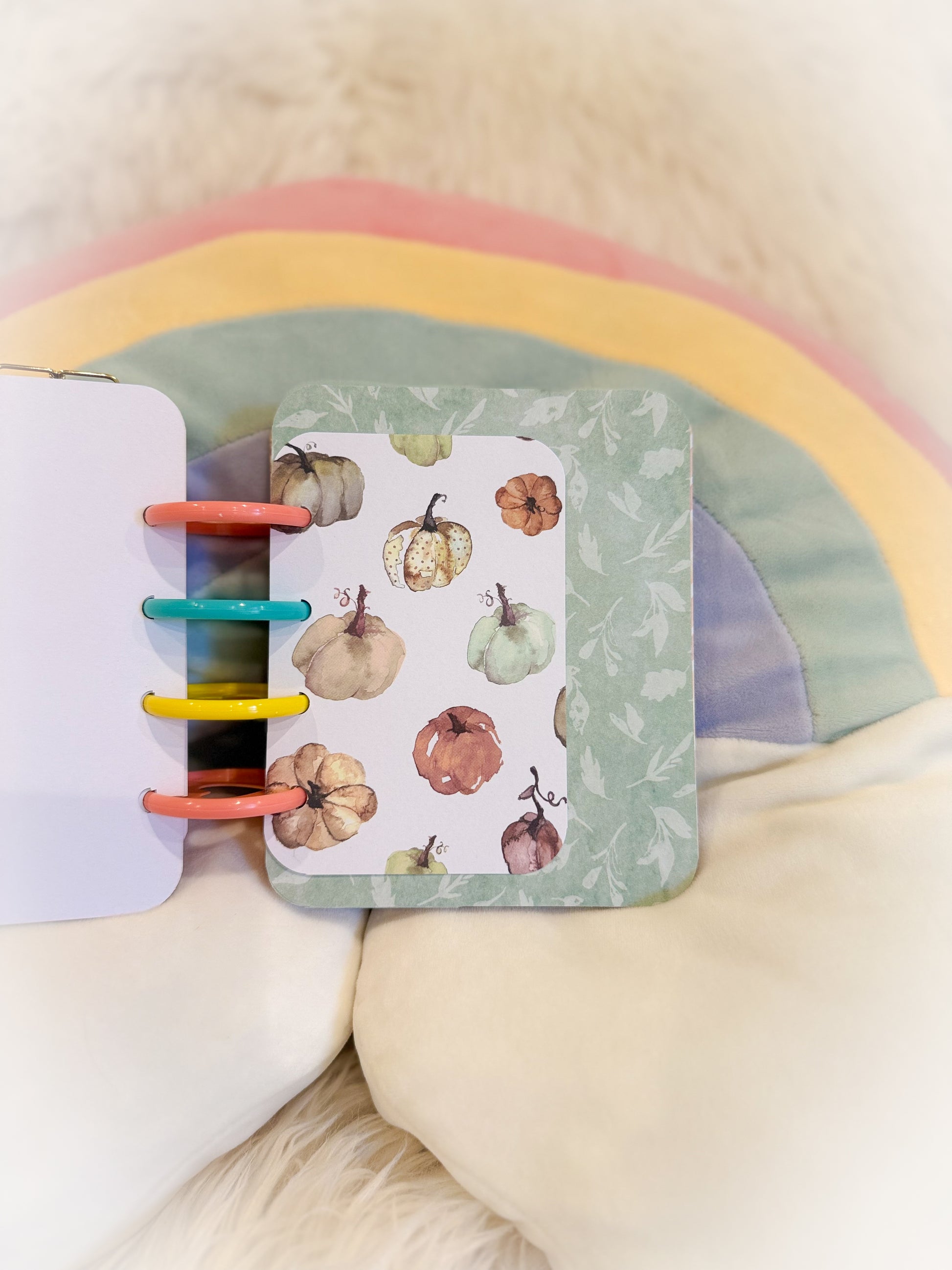 This beautiful 4 disc bound Fall themed journal is perfect for use as a journal/photo album, makes a great gift for you or a friend , fits nicely into your purse, backpack & more, and is wonderful for memory keeping on the go!! Each page is different with a beautiful Fall theme thru the entire book from cover to cover. Some pages have tuck spots some have fold outs, foiled inserts & many more. The disc bound design makes it very easy to add and remove pages for easy embellishing & memory keeping.