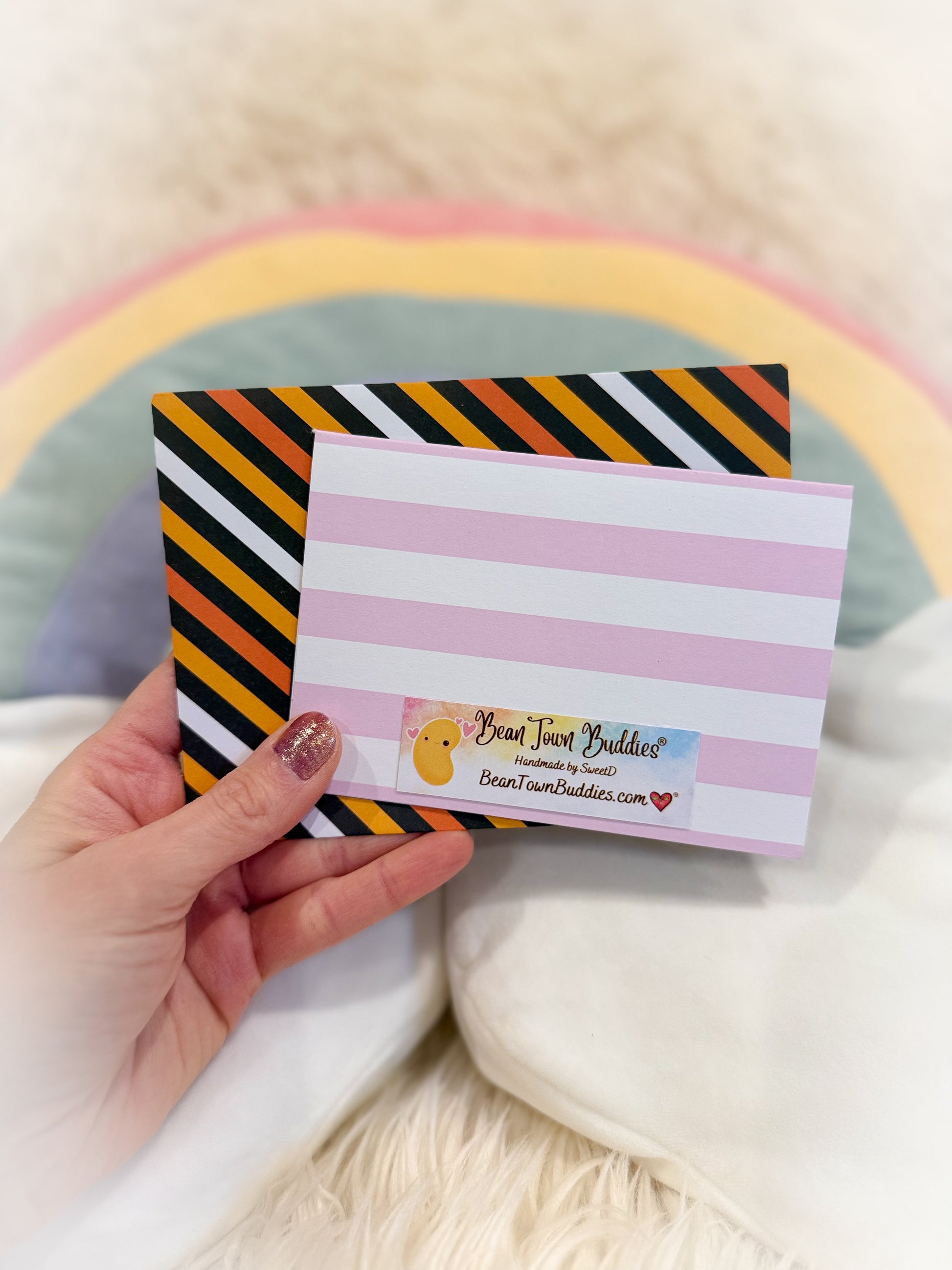 With Halloween right around the corner now is the perfect time to send your special happy mail recipients a little something special. This beautiful one of a kind halloween card is flat for easy mailing and only requires one stamp to mail within the US. This makes sending your holiday cards less expensive and safer for the card ensuring they arrive to your recipient safely. It's adorned with an adorable halloween trick or treat scene that features stamped and die cut watercolor images for a truly unique one of a kind look and feel.