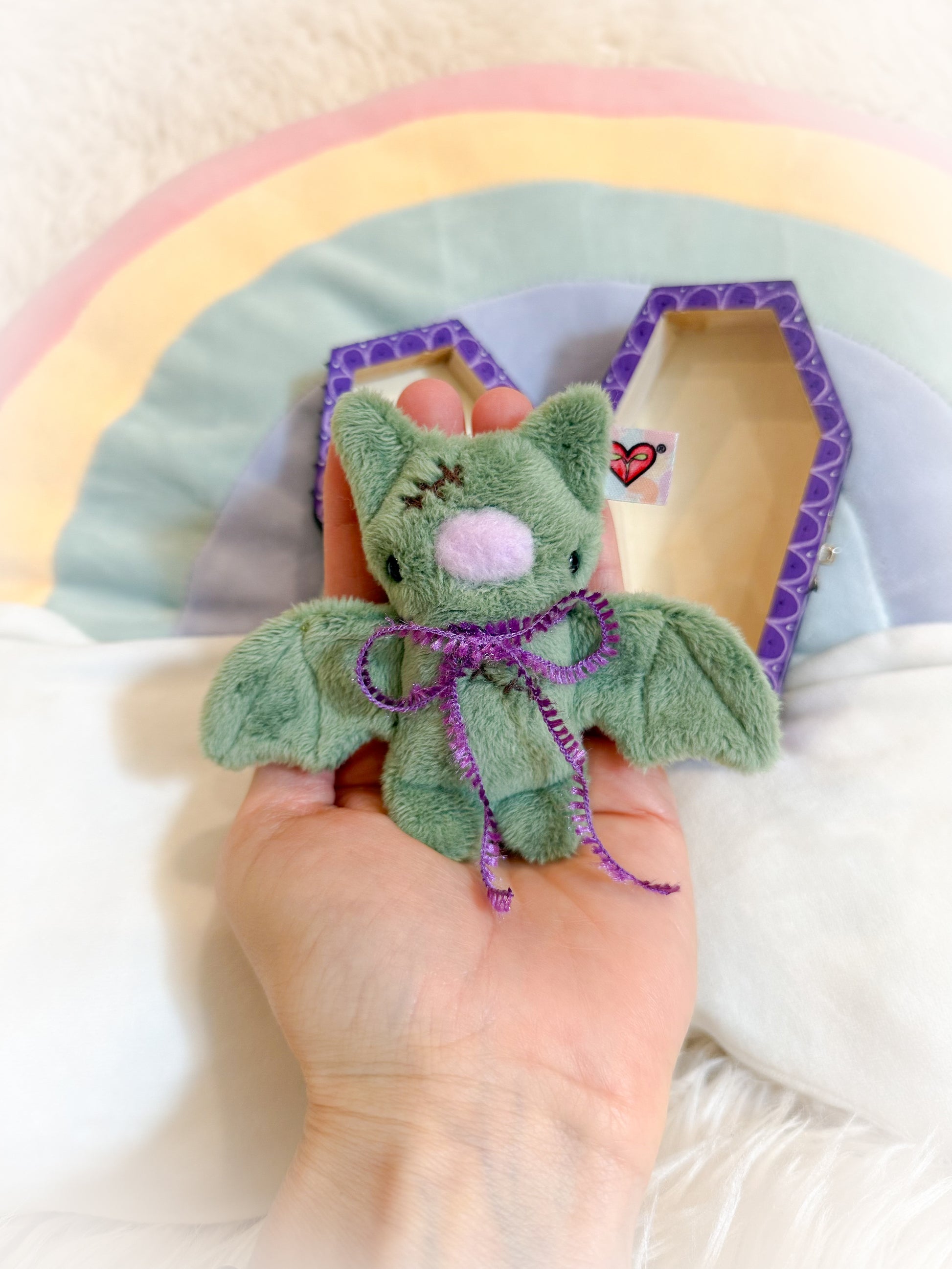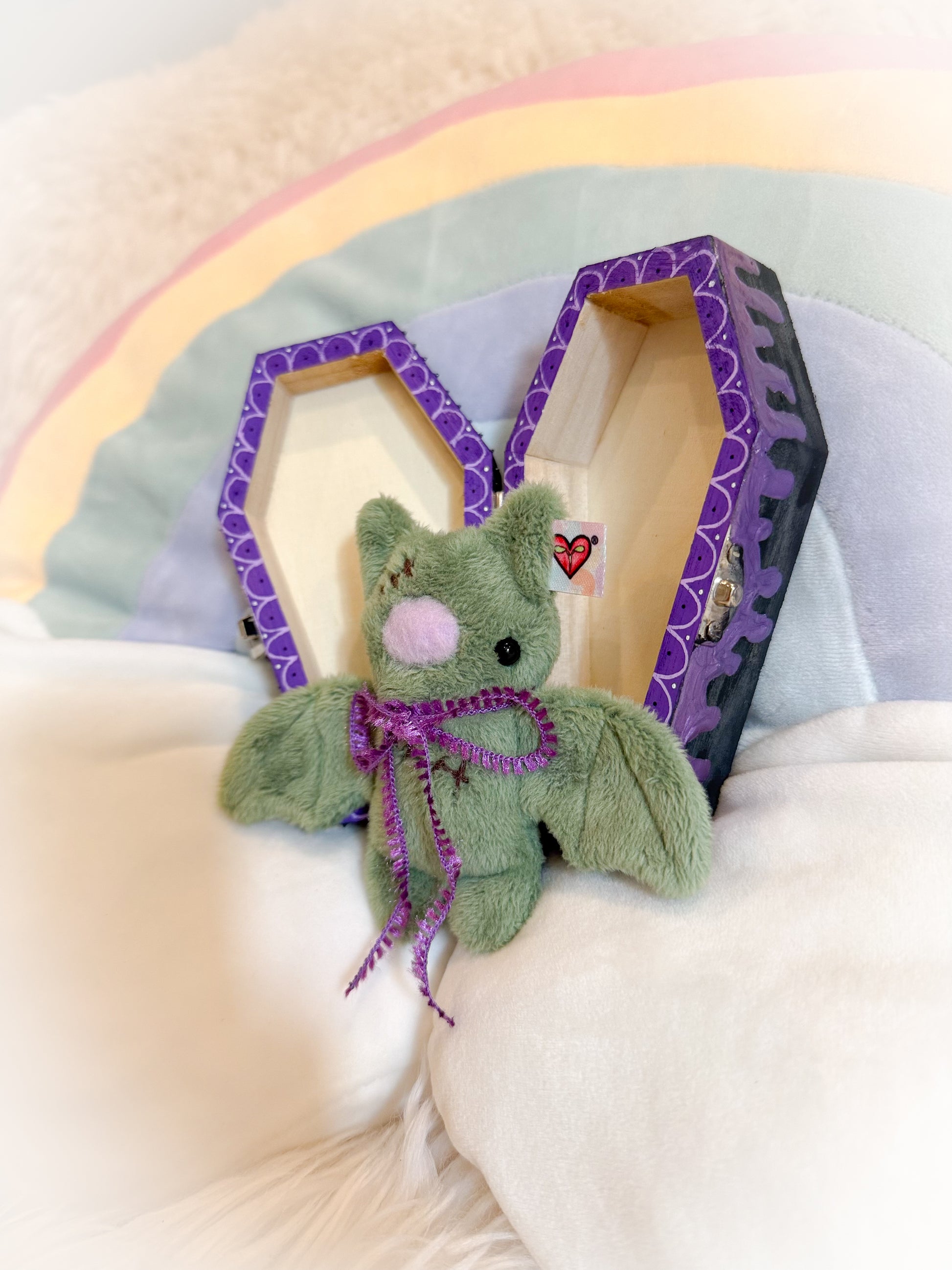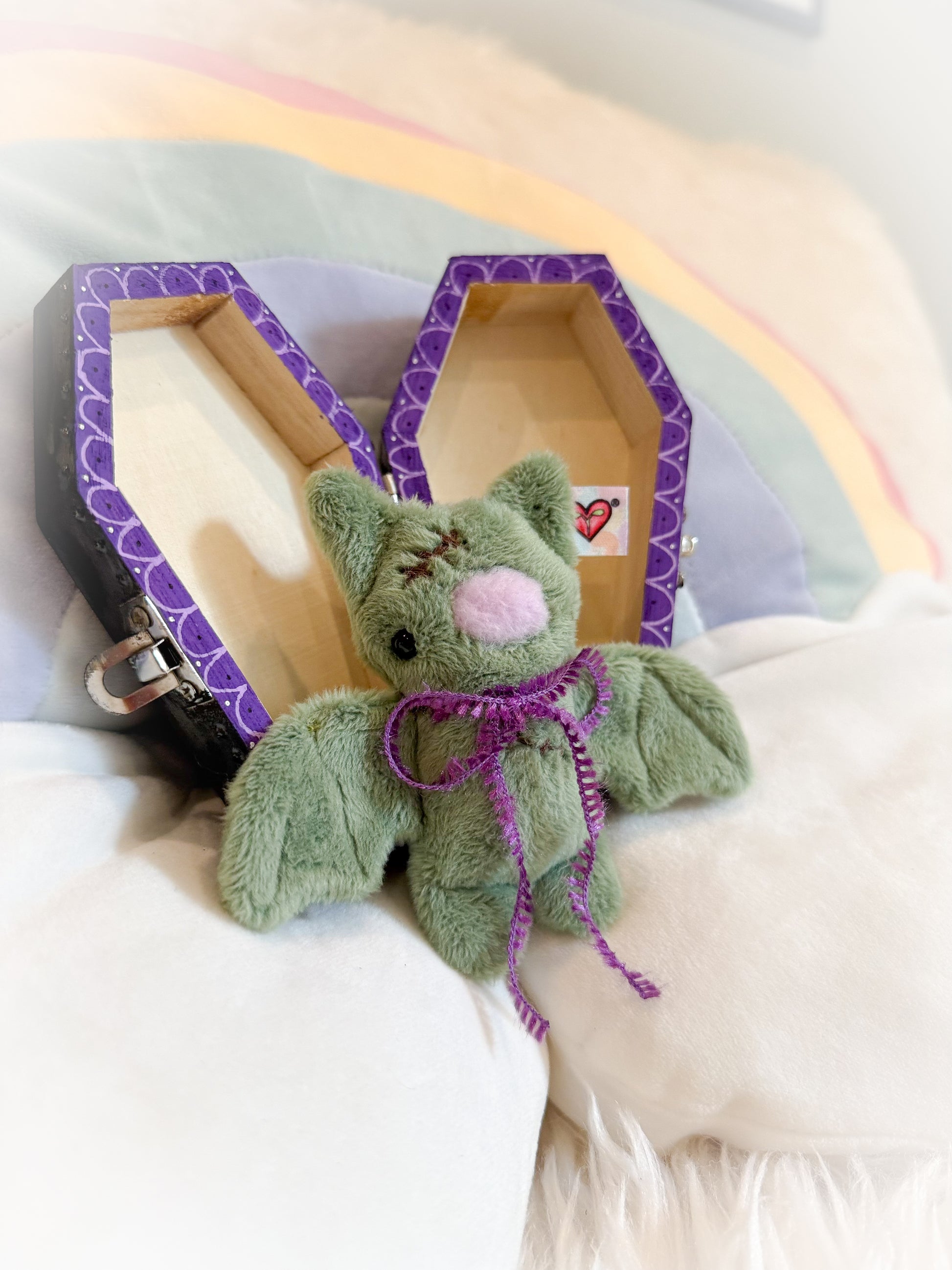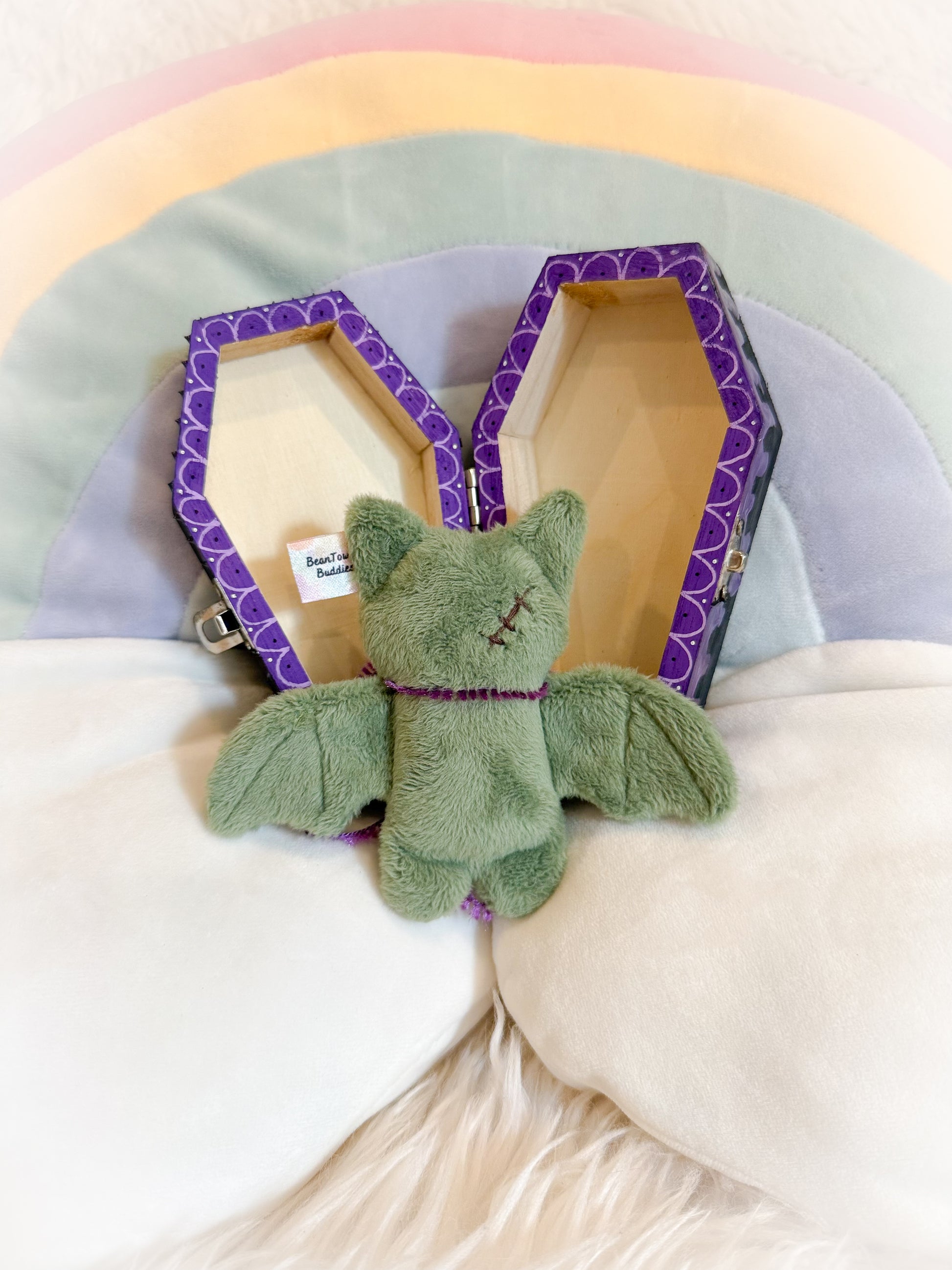 Please welcome the newest additions to BeanTown Buddies® Best Selling bat collection... the Tiny Bats!! This version is our limited edition 1 of 2 Franki style bat, that comes their very own hand painted and embellished wooden coffin. They fit perfectly inside for easy travel, display, & storage. These cuties are brand spanking new for 2025 and have never been made in this smooth style fabric before now so be sure to snag yours today for your collection before they flip, flap, and fly out of the shop!!