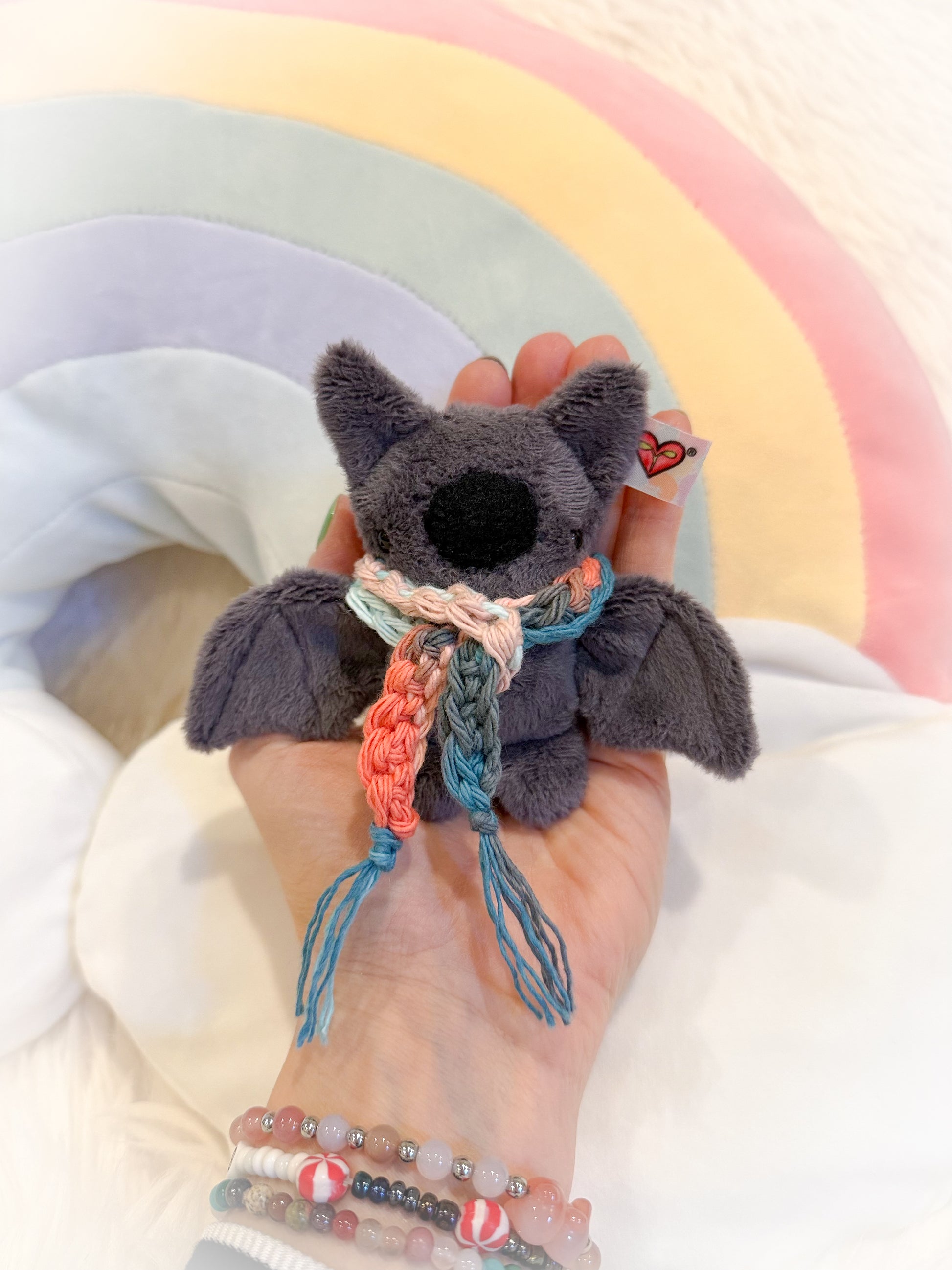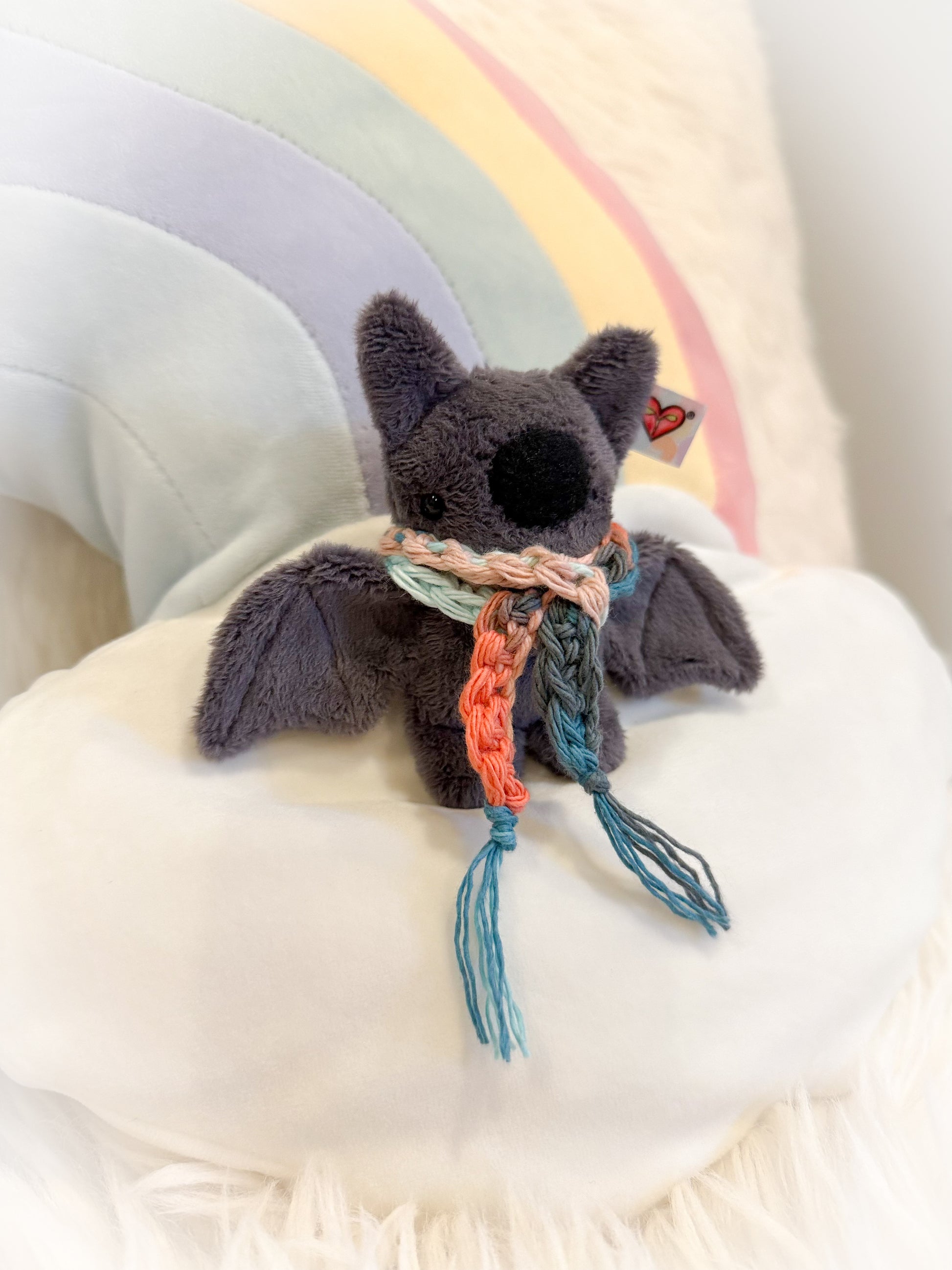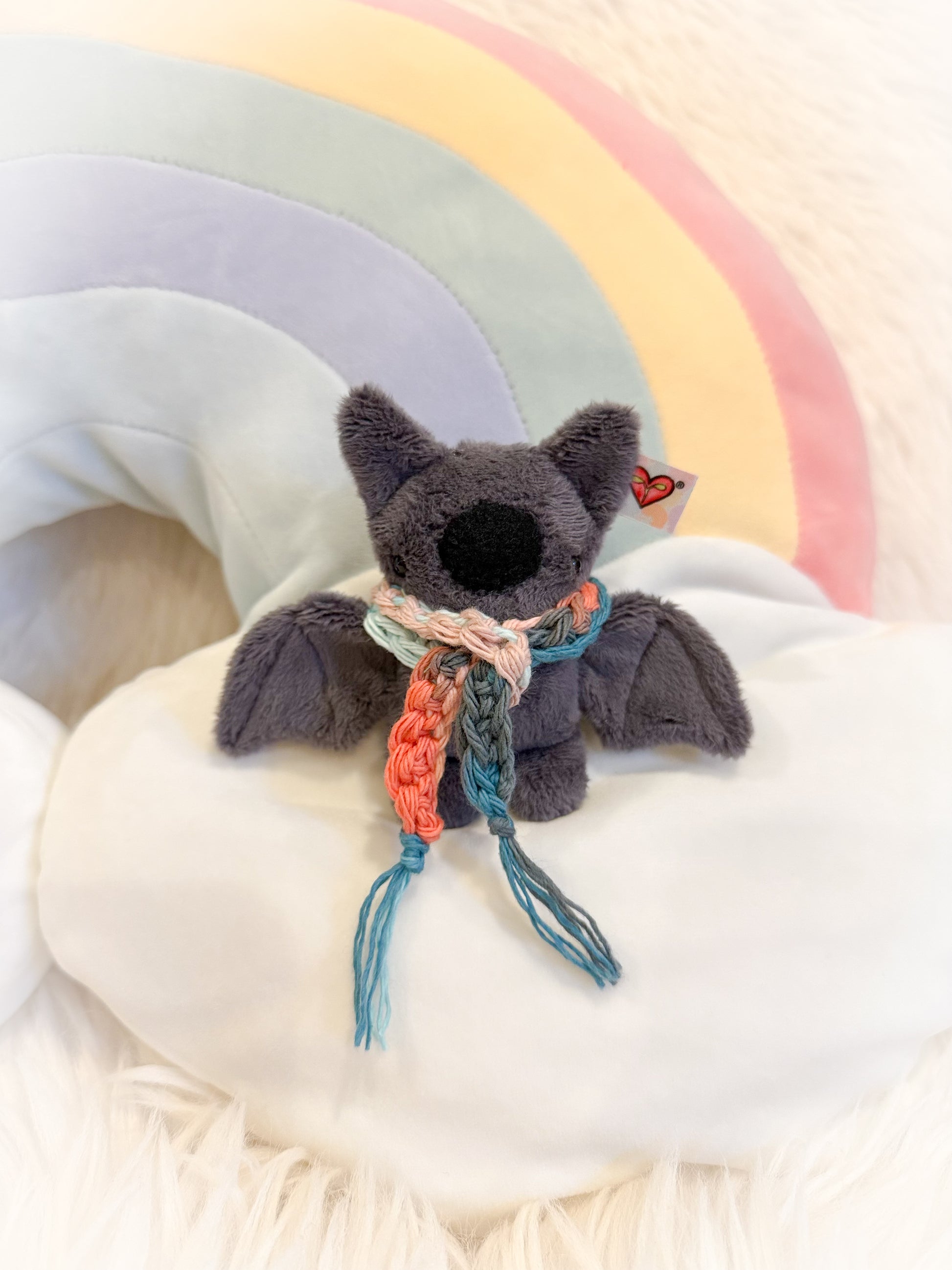 Tiny Bat is the perfect size for easy tag along companionship, they fit easily into your purse, backpack, picnic basket, diaper bag, fanny pack and of course your hands. Each comes with its own hand crochet coordinating, removable scarf, and is weighted with glass for ultimate fidget comfort without all the noise of traditional fidget toys.