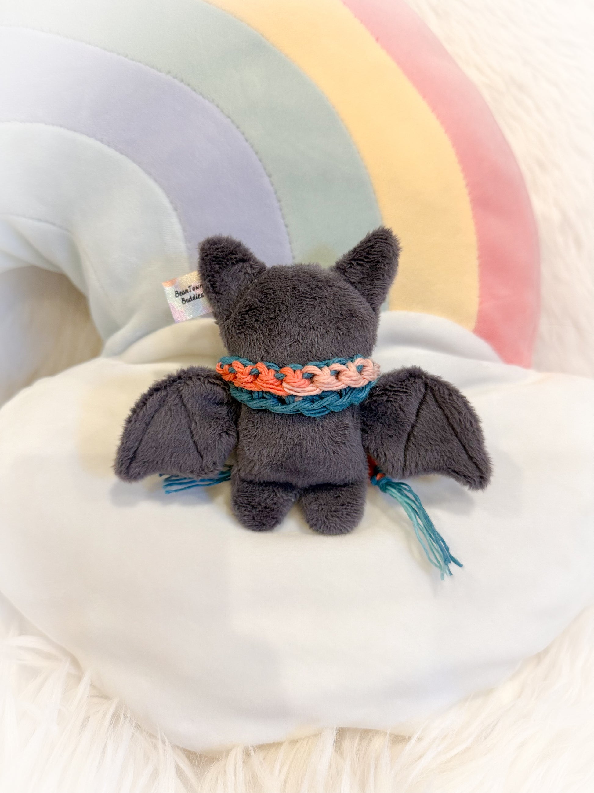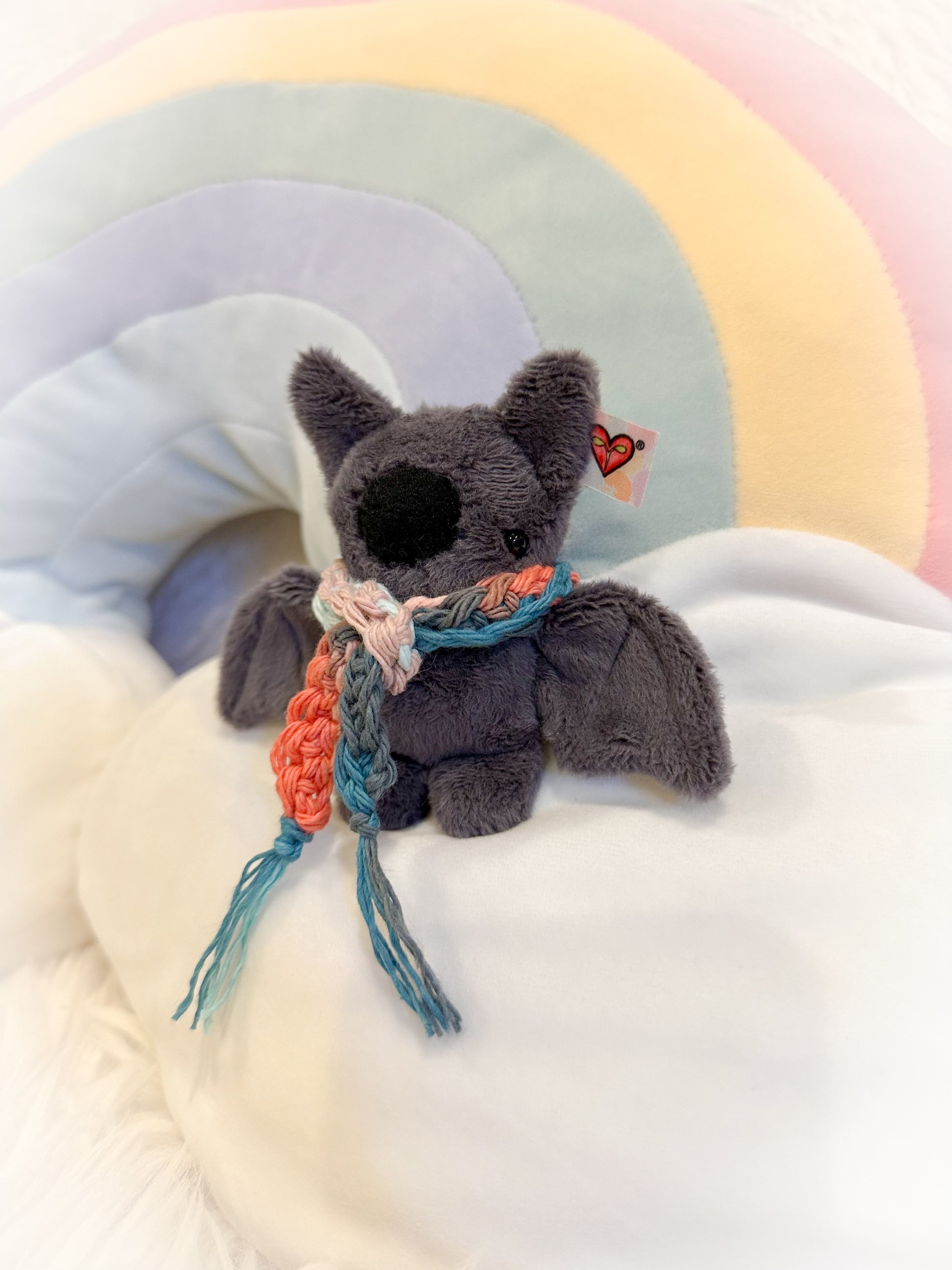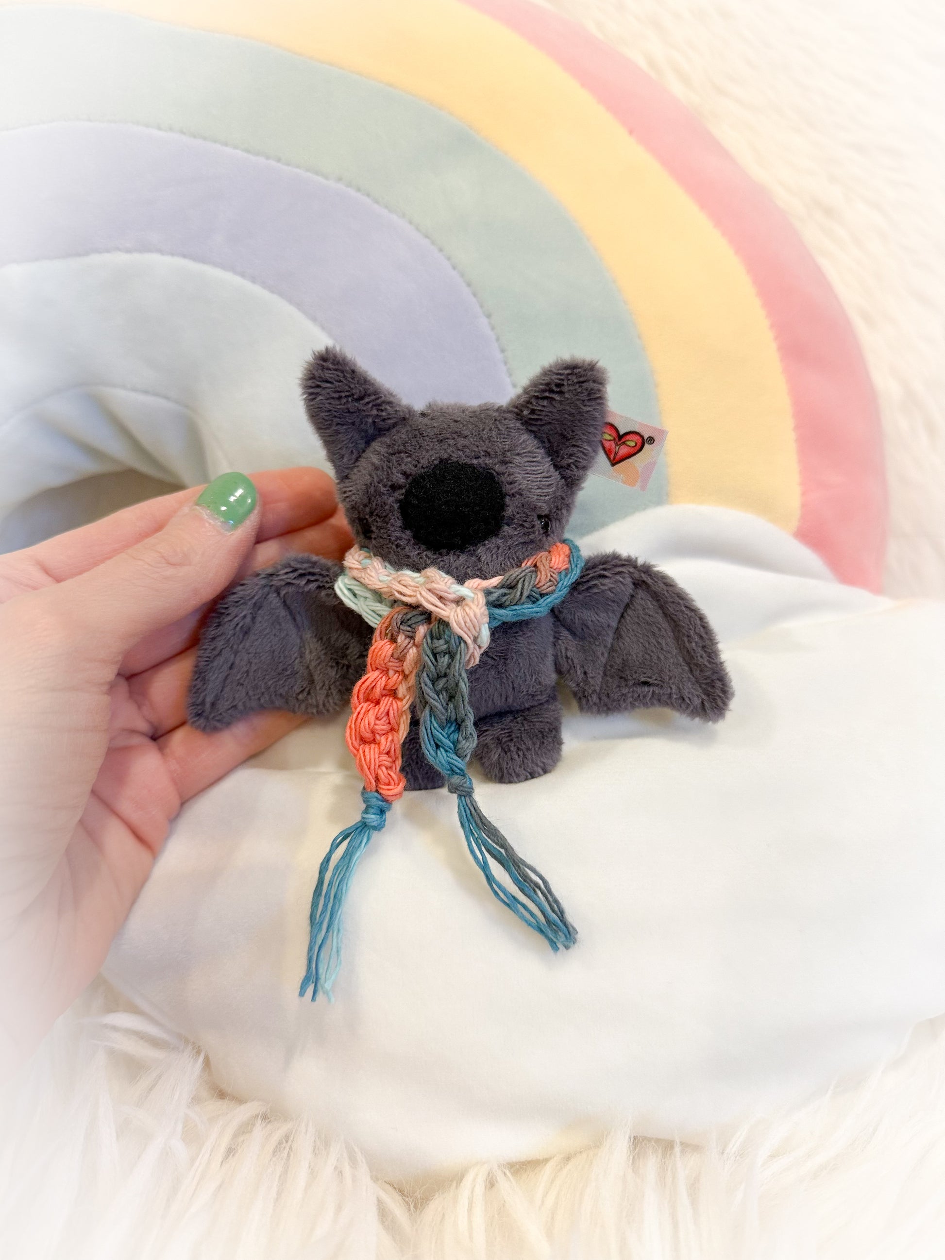 Tiny Bat is the perfect size for easy tag along companionship, they fit easily into your purse, backpack, picnic basket, diaper bag, fanny pack and of course your hands. Each comes with its own hand crochet coordinating, removable scarf, and is weighted with glass for ultimate fidget comfort without all the noise of traditional fidget toys.