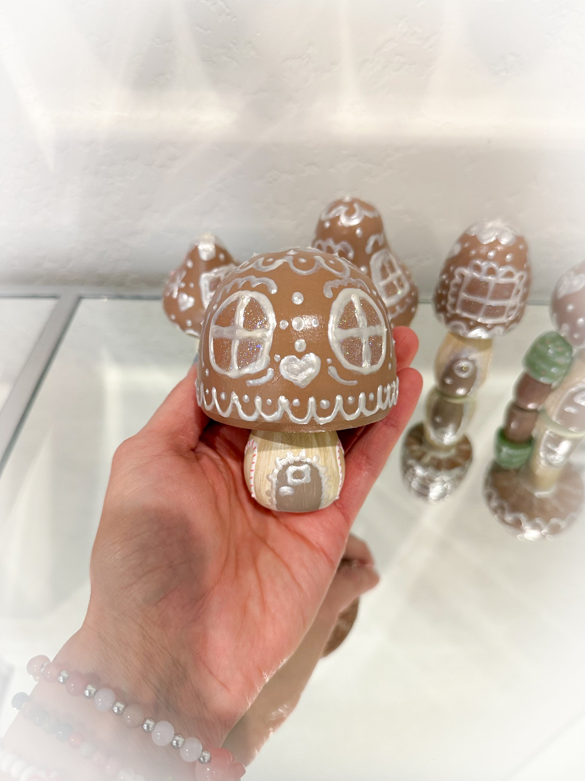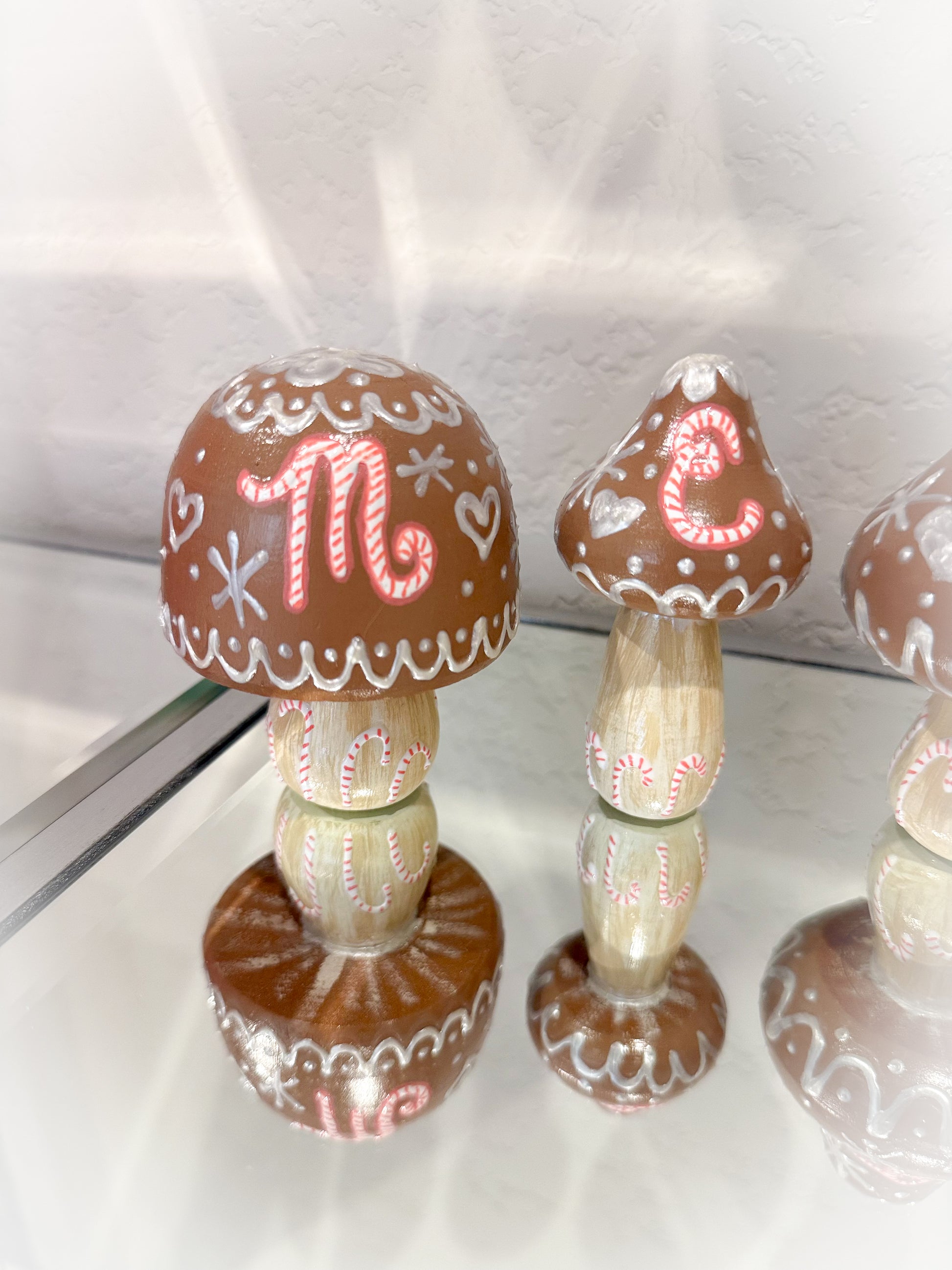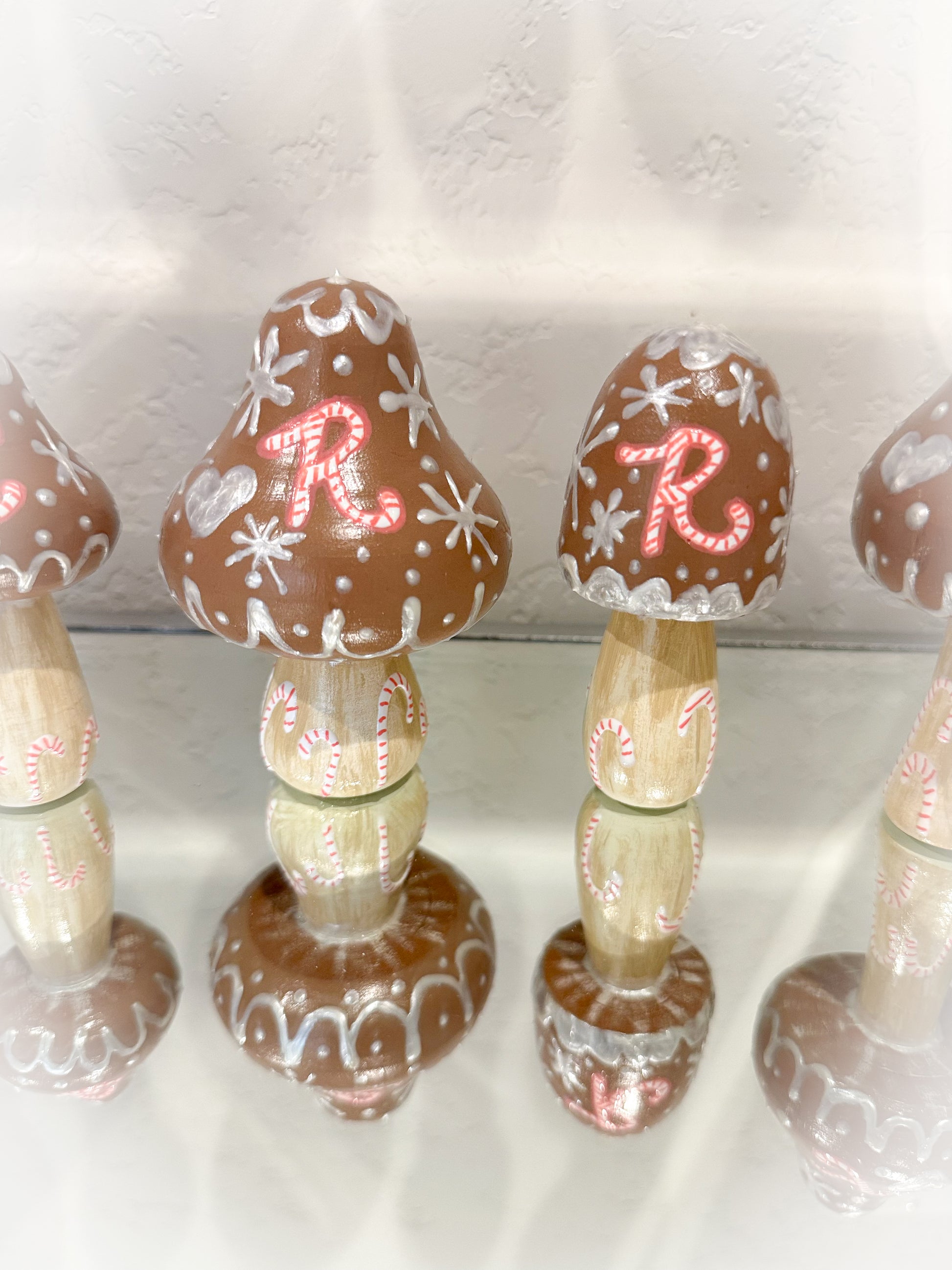 This beautiful wooden mushroom set of 5 is on a whole other level of delicious, whimsical, magical, and amazing!! Each of the 5 wood mushrooms is painted like an adorable little gingerbread house on one side & the other sides spell out "Merry" in candy cane style writing. This multi function set can be used as stand alone pieces for your tier tray & more OR display them in a line to spell out "Merry". Each design is completely different from the next mushroom and the whole set really is unique and special in all the most magical ways.